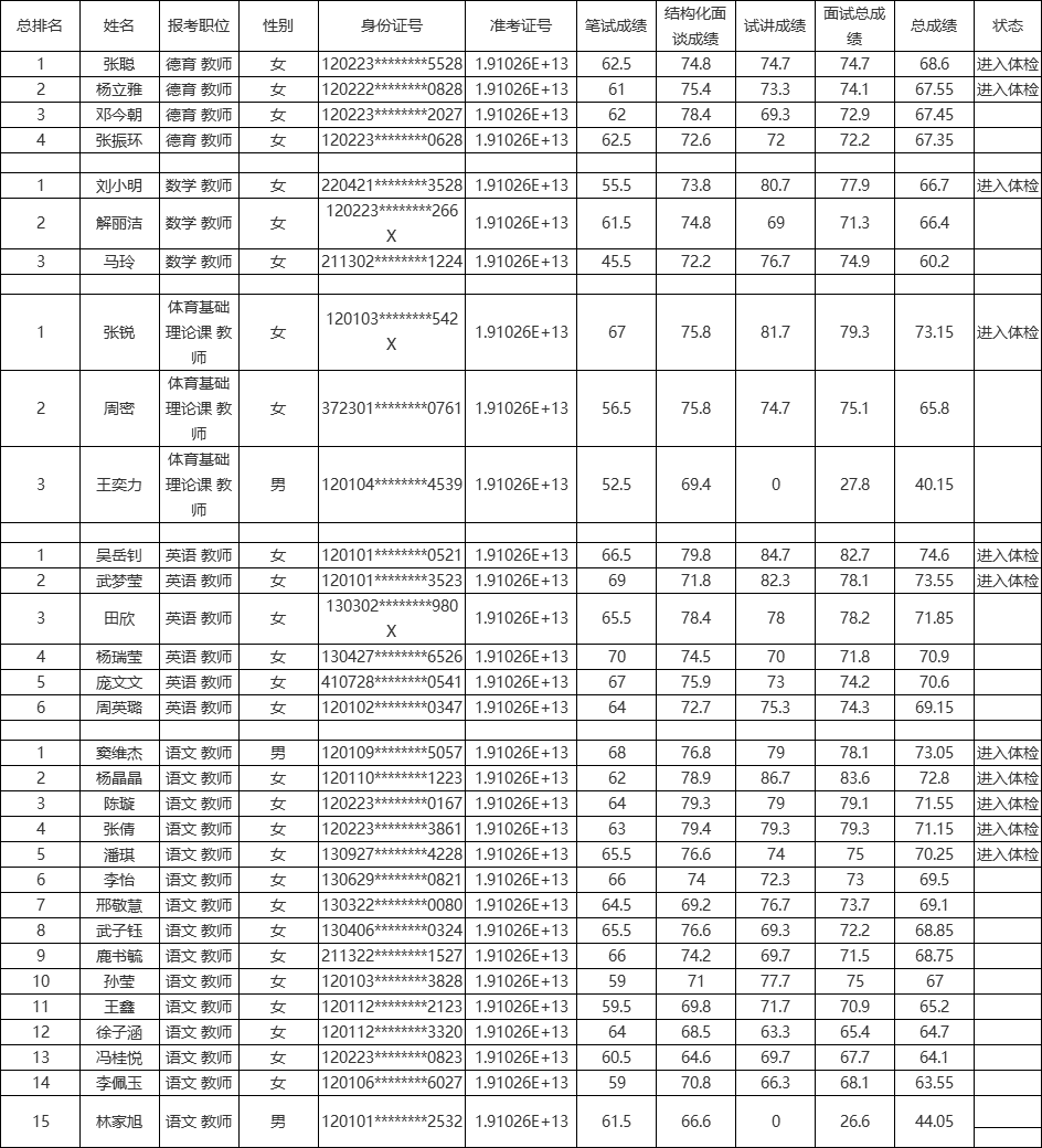 天津市体育运动学校公开招聘教师总成绩