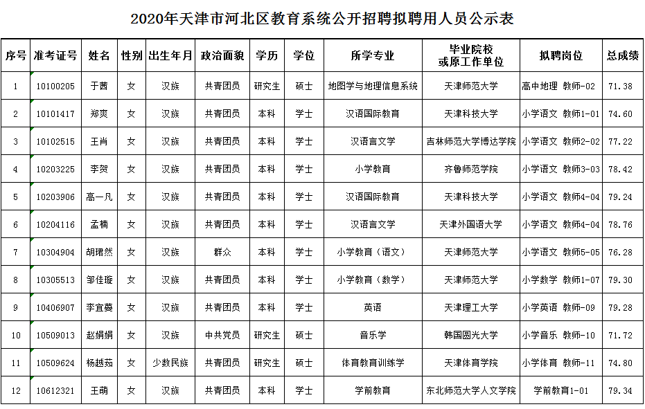 附:2020年天津市河北区教育系统公开招聘拟聘用人员公示表