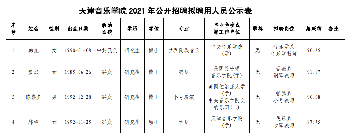 天津音乐学院2021年公开招聘-通知30(教师岗位拟聘用人员公示)