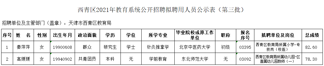 西青区2021年教育系统公开招聘工作人员,经报名、笔试、面试、体检、考察等环节,第三批共计2人符合条件,按照《西青区2021年事业单位公开招聘工作人员公告》,现将第三批拟聘用人员予以公示。