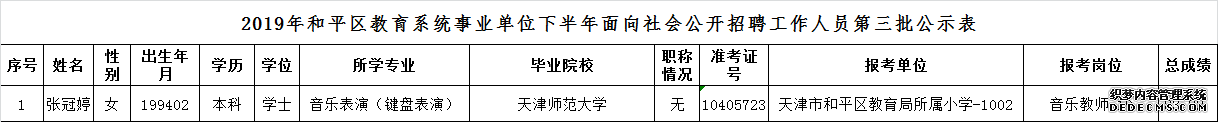 天津市和平区2019年下半年教育系统事业单位面向社会公开招聘工作人员第三批公示