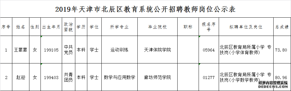 2019年天津市北辰区教育系统公开招聘工作人员拟聘用人员公示