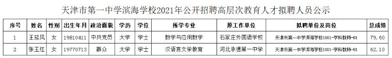 天津市第一中学滨海学校2021年公开招聘高层次教育人才公示