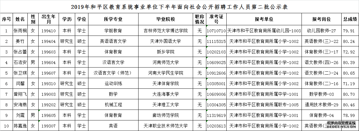 天津市和平区2019年下半年教育系统事业单位面向社会公开招聘工作人员第二批公示