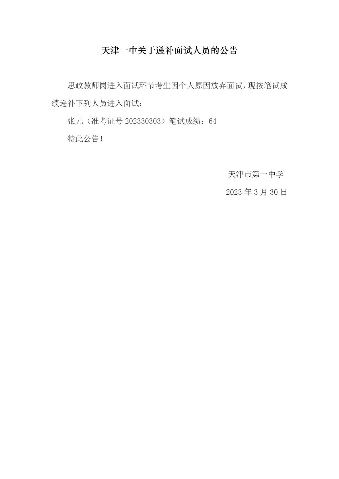 天津一中关于递补面试人员的公告