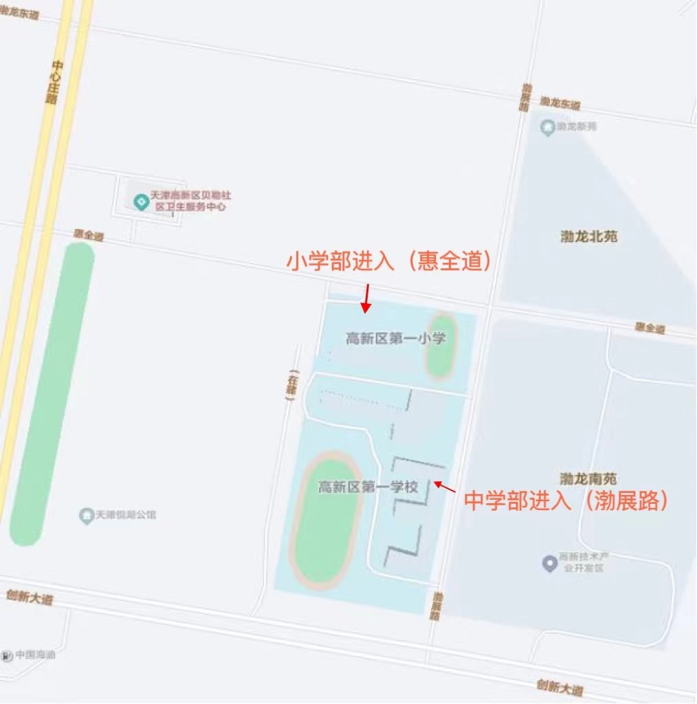 2、中学部:天津滨海高新技术产业开发区第一学校(中心庄路与创新大道交汇处东,渤展路中学部(东门)校门进入)