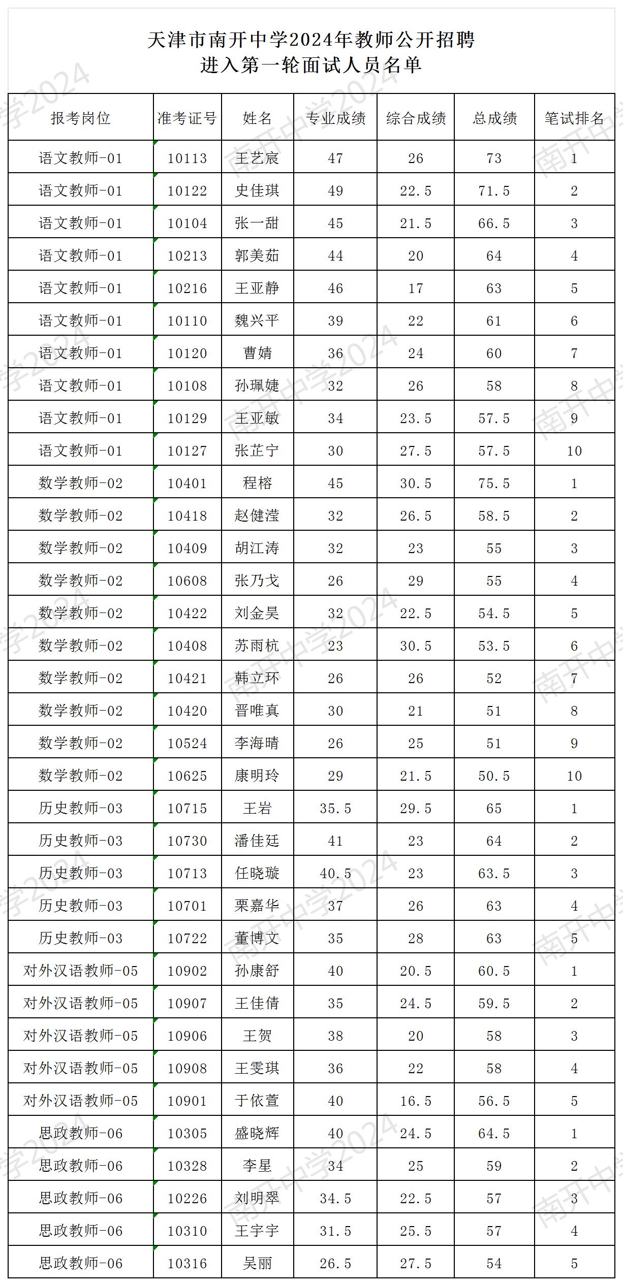 天津市南开中学2024年教师招聘工作笔试环节完成,考生可登陆天津市人才服务中心网站(https://www.tjtalents.com.cn/)个人账户查询成绩。
