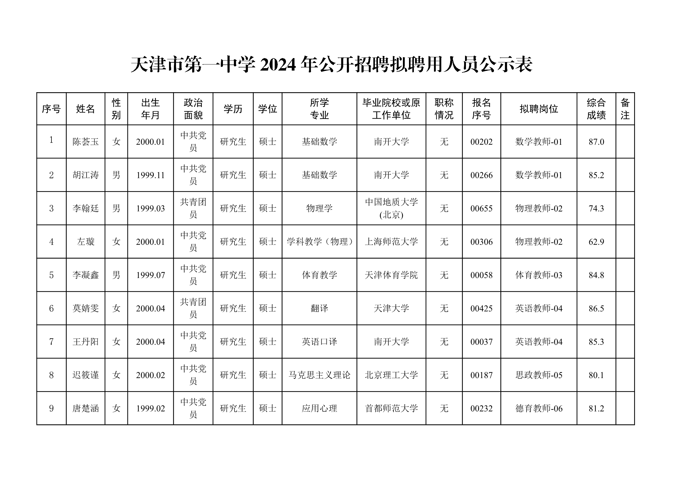 天津市第一中学2024年公开招聘拟聘用人员公示