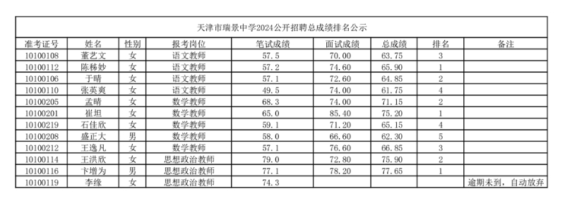 天津市瑞景中学2024公开招聘总成绩排名公示