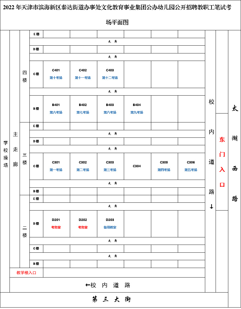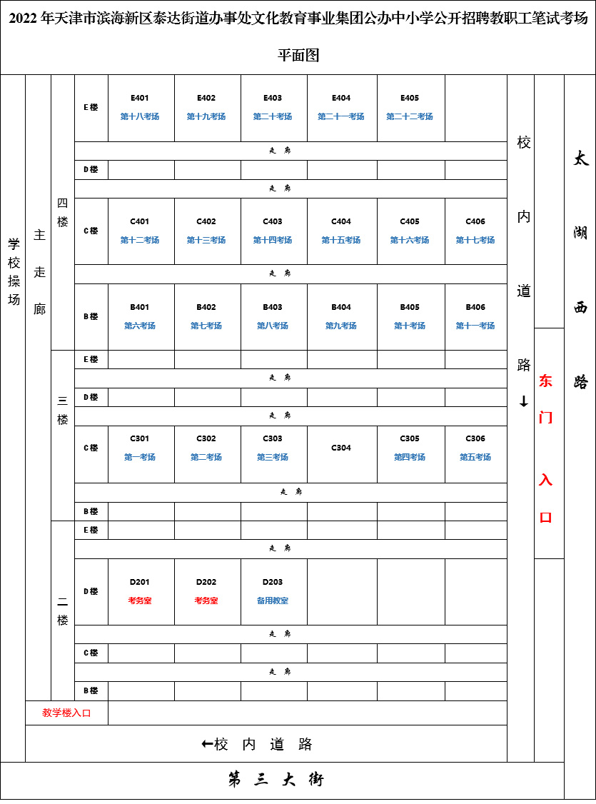 以下为2022年天津市滨海新区泰达街道文化教育事业集团公办中小学、幼儿园公开招聘教职工笔试考场分布示意图,请各位考生根据自己的报考学科和准考证号,按时准确到达指定考点参加笔试。提醒各位考生于笔试当天进入考场前准备好考试前48小时内(依采样时间)核酸检测阴性证明、天津健康码绿码(8月4日更新)及行程码绿码的截图并出示给入口处工作人员进行验证,扫描场所码,上交笔试健康卡及安全考试承诺书、流调表(网站公告附件下载打印)后才可进入考场。