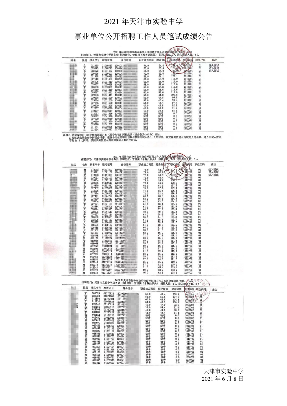 2021年天津市实验中学事业单位公开招聘工作人员笔试成绩公告