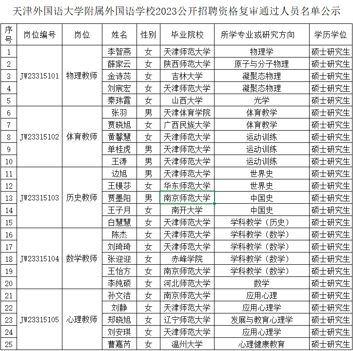 天津外国语大学附属外国语学校2023公开招聘资格复审通过人员名单公示
