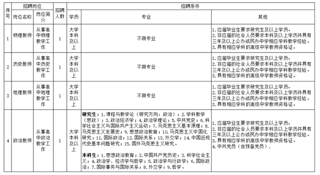 2. 应届毕业生要求研究生及以上学历,非应届的社会人员要求本科及以上学历并具有三年及以上公办或民办中学相应学科教学经验。