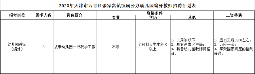 单位、岗位人数及资格条件等详见附件1《2023年天津市西青区张家窝镇镇属公办幼儿园编外教师招聘计划表》,应聘人员从2023年9月7日开始,可通过天津人才网(www.tjrenliziyuan.com)进行查询。