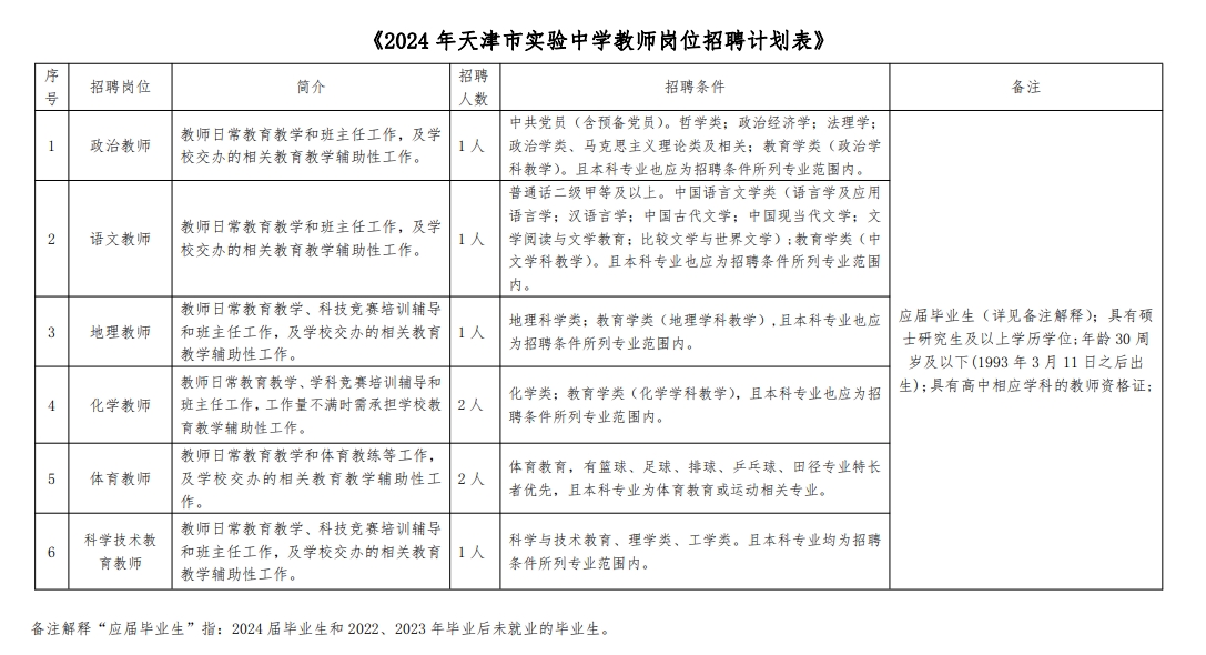 详见《2024 年天津市实验中学教师岗位招聘计划表》 (年龄要求“30 周岁及以下”,以报名开始时间界定,如报名开始时间为 2024 年 3 月 11 日,则应聘人员出生日期应为 1993 年 3 月 11 日之后。)