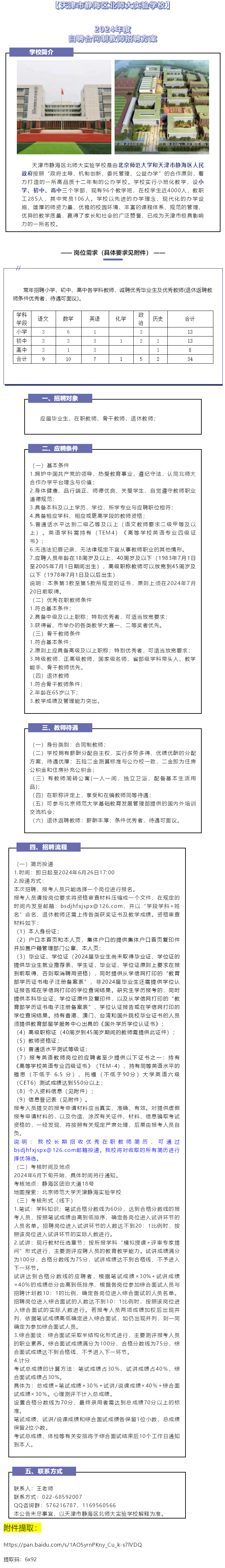 【天津市静海区北师大实验学校】2024年学校自聘合同制教师34人招聘方案