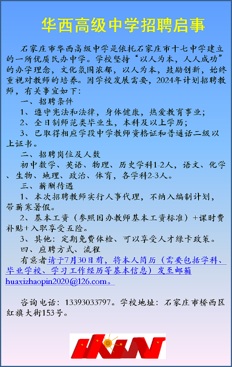 石家庄市华西高级中学是依托石家庄市十七中学建立的一所优质民办中学。学校坚持“以人为本,人人成功”的办学理念,文化氛围浓郁,以人为本,鼓励创新,始终重视对教师的培养。因学校发展需要,2024年计划招聘教师,有关事宜如下: