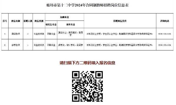 廊坊市第十二中学2024年合同制教师招聘3人公告