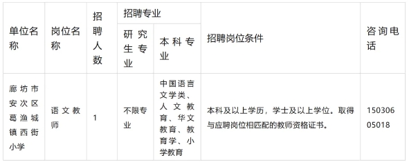 廊坊市安次区葛渔城镇西街小学合同制教师招聘1人实施方案