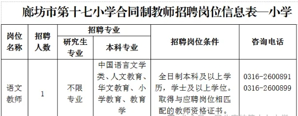 (五)具有岗位要求的相应学历、学位、专业、教师资格证。详见附件《廊坊市第十七小学合同制教师招聘岗位信息表》。