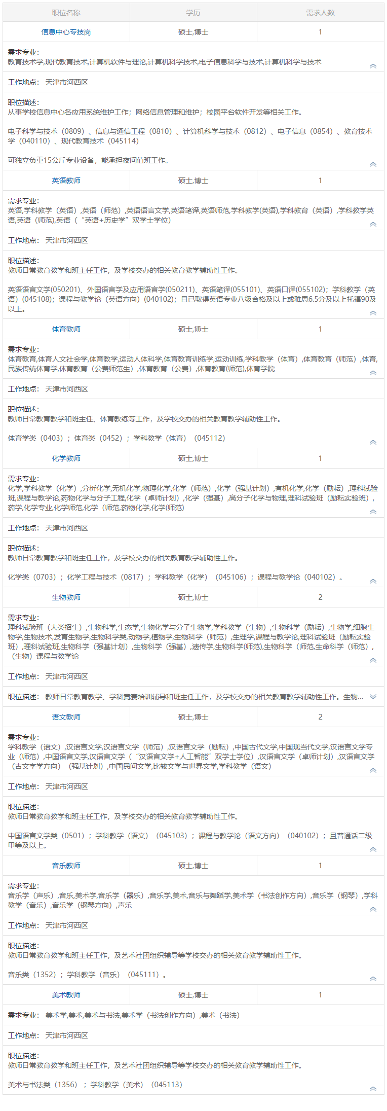 详见《2026年天津市实验中学教师岗位招聘计划表》