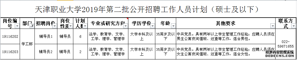 为进一步规范公开招聘工作,优化学校人才结构,根据《天津市事业单位公开招聘人员实施办法》等有关文件要求,我校2019年第二批公开招聘工作人员中辅导员岗位共计8人。为确保招聘工作顺利进行,现将招聘工作通知如下: