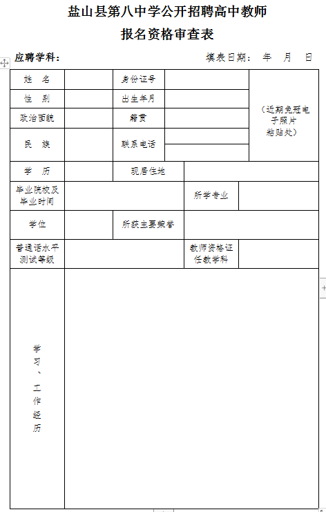 附件:盐山县第八中学公开招聘高中教师报名资格审查表
