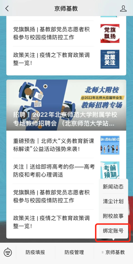 第二步:进入微信公众号,点击菜单栏“京师基教”,选择“绑定账号”,按照相关提示完成操作;