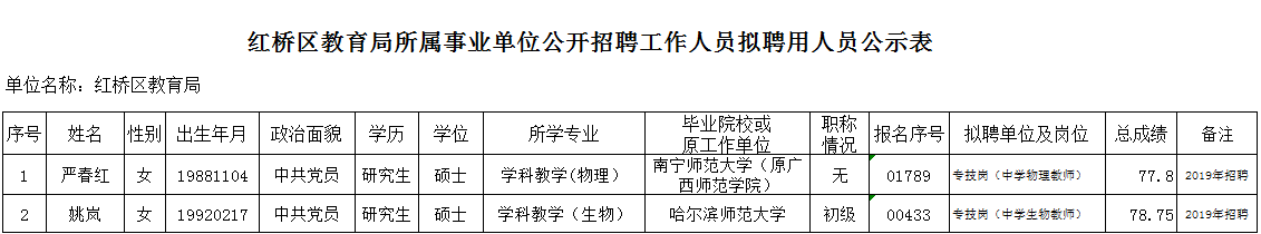 附件:红桥区教育局所属事业单位公开招聘工作人员拟聘用人员公示表