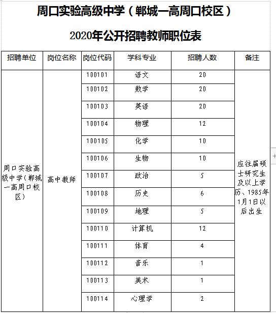 根据周口实验高级中学(郸城一高周口校区)编制核定和教学需求,2020年面向应往届毕业生公开招聘一批教师,纳入周口市财政编制。