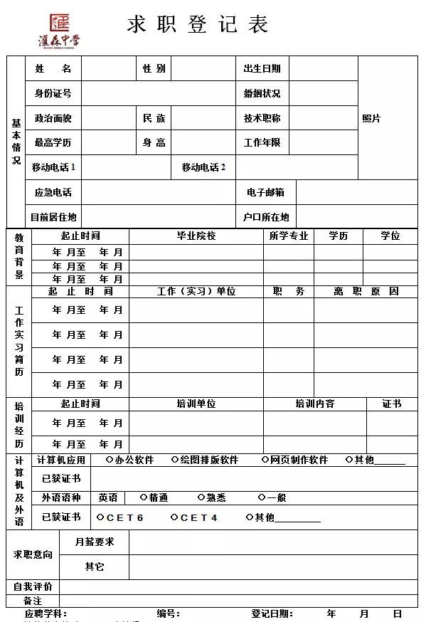 符合条件的应聘人员请将《求职登记表》、《个人信息资料表》填写完整( ★ 必填,无需再发送其他个人资料 ★ ),发至hsxzbgs@163.com。请扫下方二维码或搜索微信号“tjhszxzp”,关注“天津市汇森中学招聘”微信公众平台,后续笔试、面试等应聘程序将由此平台发布,请密切关注。