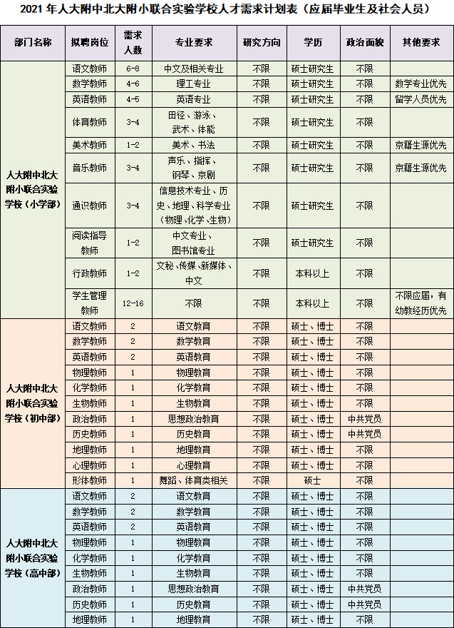人大附中北大附小联合实验学校2021年招聘启事