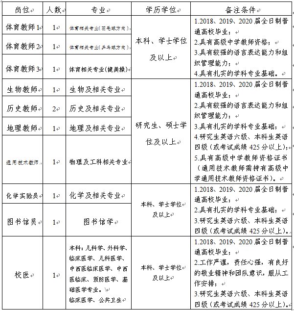 我校2020年拟招聘体育教师3名,生物教师1名,历史教师2名、地理、通用技术教师各 1名、化学实验员1名、图书馆员1名、校医1名。应聘人员应为2018、2019、2020届全日制普通高校毕业生。(2018、2019届须为未派遣人员,2020届须于2020年7月31日前取得毕业证、学位证)