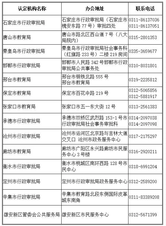 河北省各认定机构联系方式