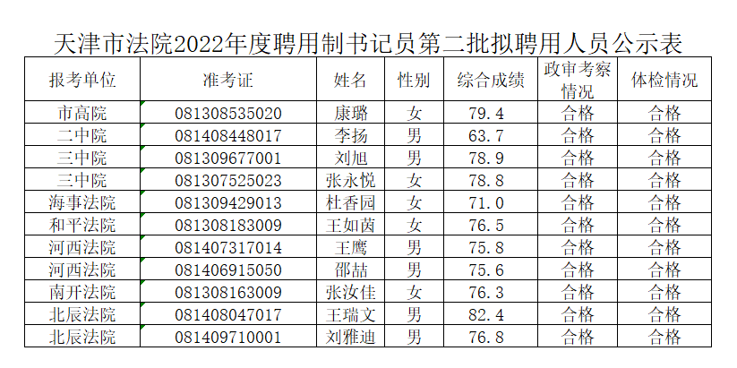 - 2022年天津市人民法院公开招录聘用制书记员第十批拟聘用人员公