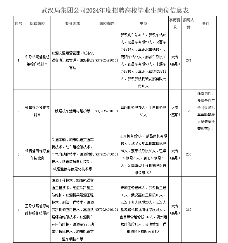 附:武汉局集团公司2024年度招聘高校毕业生岗位信息表