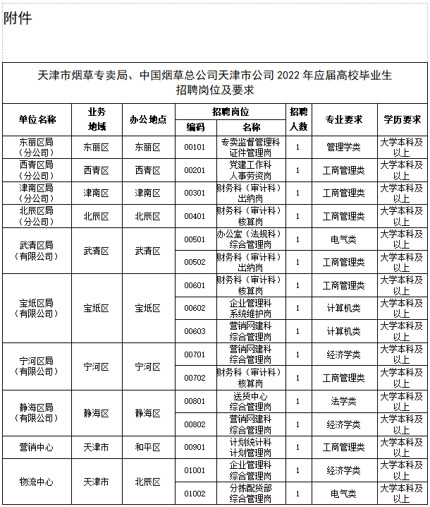 根据工作需要,天津市烟草专卖局、中国烟草总公司天津市公司现公开招聘应届高校毕业生。