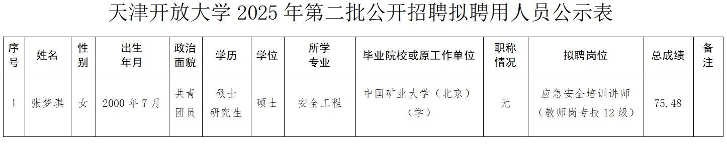 天津开放大学2025年第二批公开招聘拟聘用人员公示