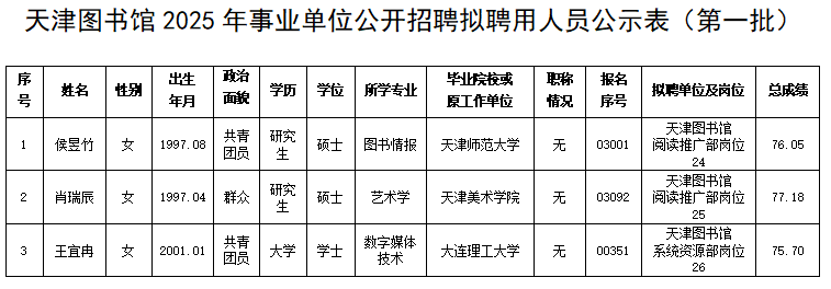 天津图书馆2025年事业单位公开招聘拟聘用人员公示(第一批)
