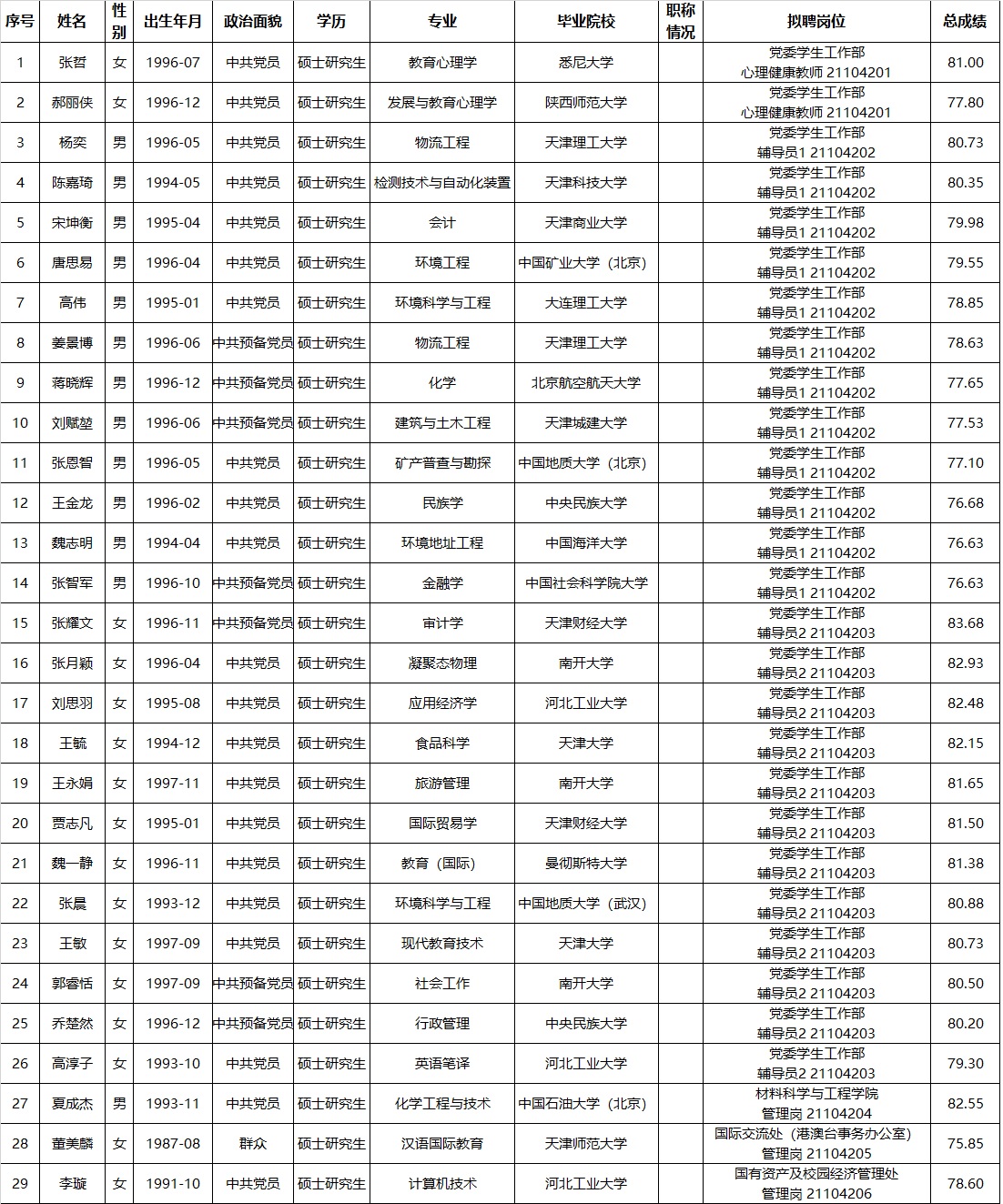 天津理工大学2021年公开招聘部分岗位拟聘人员公示0819