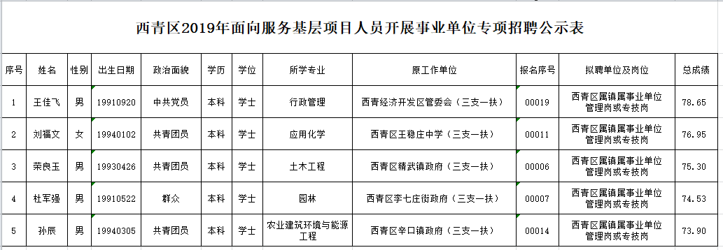 西青区2019年面向服务基层项目人员开展事业单位专项招聘工作,经报名、笔试、面试、体检、考察等环节,共计5人符合条件,按照《天津市事业单位公开招聘人员实施办法(试行)》(津人社局发〔2011〕10号)要求,现将拟聘用人员予以公示。