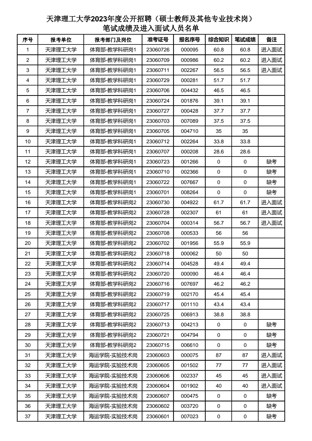 天津理工大学2023年度公开招聘(硕士教师及其他专业技术岗)笔试成绩及进入面试人员名单