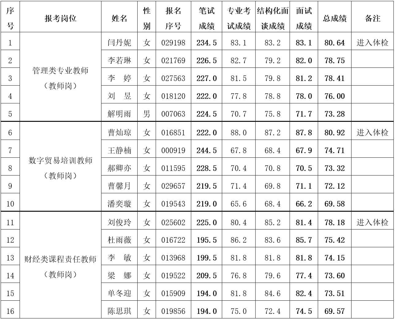 说明:1、面试成绩按专业考试成绩占80%、结构化面谈成绩占20%的比例合成。专业考试和结构化面谈成绩满分均为100分,保留1位小数,及格线均为60分。