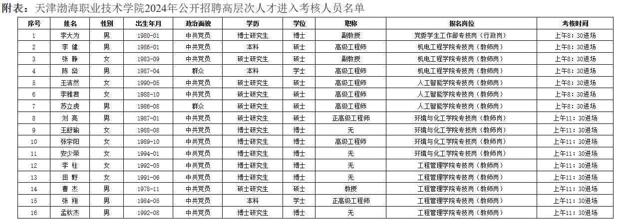 天津渤海职业技术学院2024年公开招聘高层次人才考核方案及进入考核人员名单