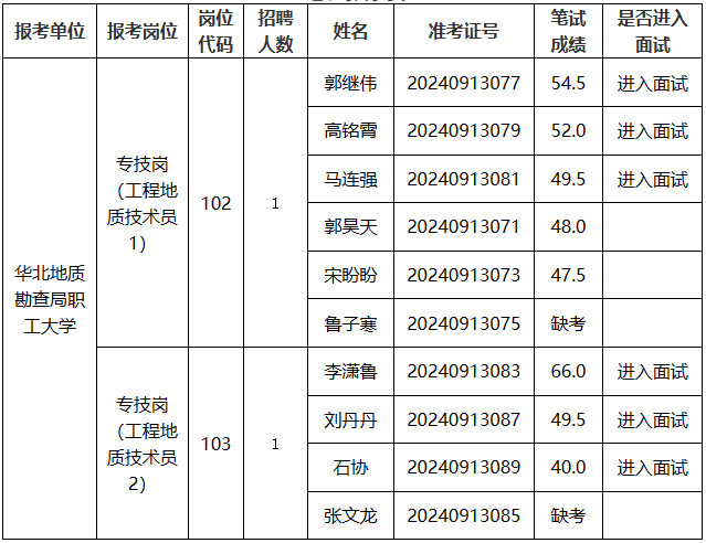 华北地质勘查局职工大学2024年第三批公开招聘工作人员笔试成绩