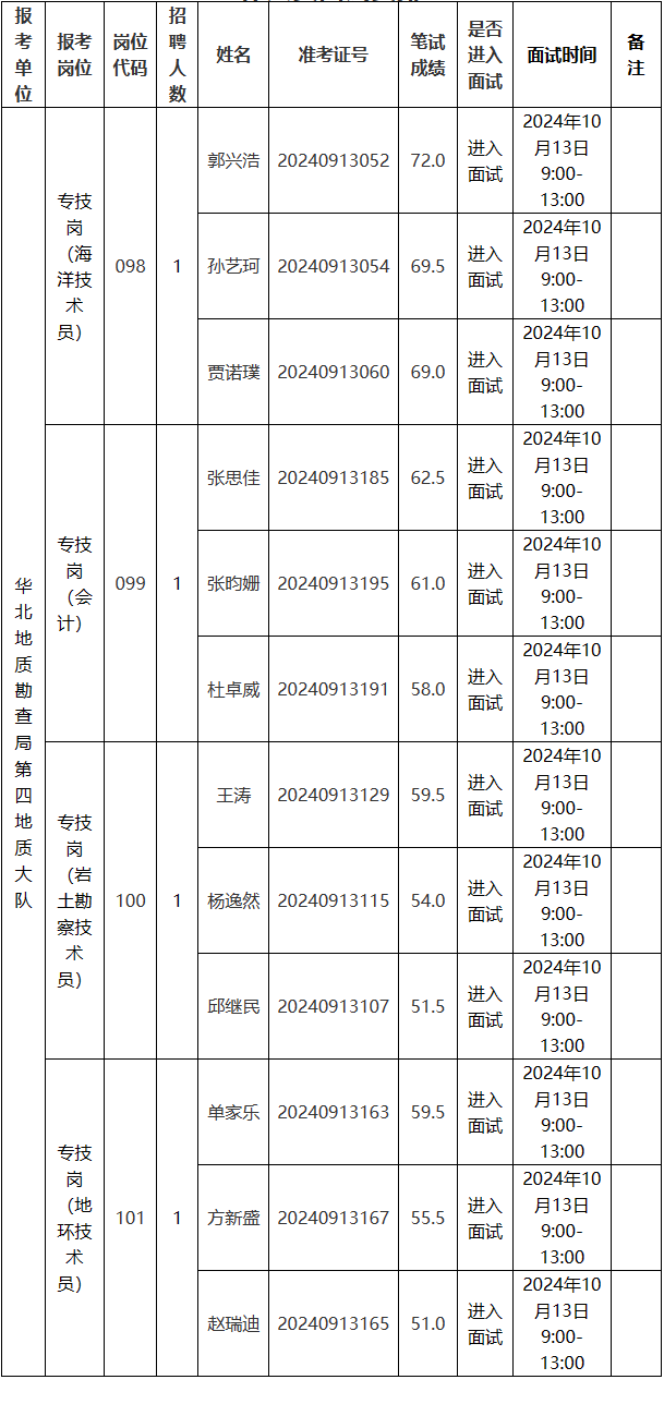 华北地质勘查局第四地质大队2024年第三批公开招聘工作人员面试安排