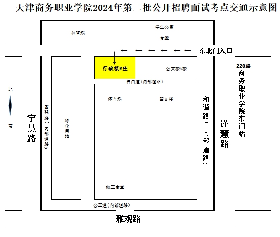 2.面试当天校内无法停放考生车辆,请从学校东北门(谨慧路、220路公交车商务职业学院东门站)步行入校。交通示意图如下: