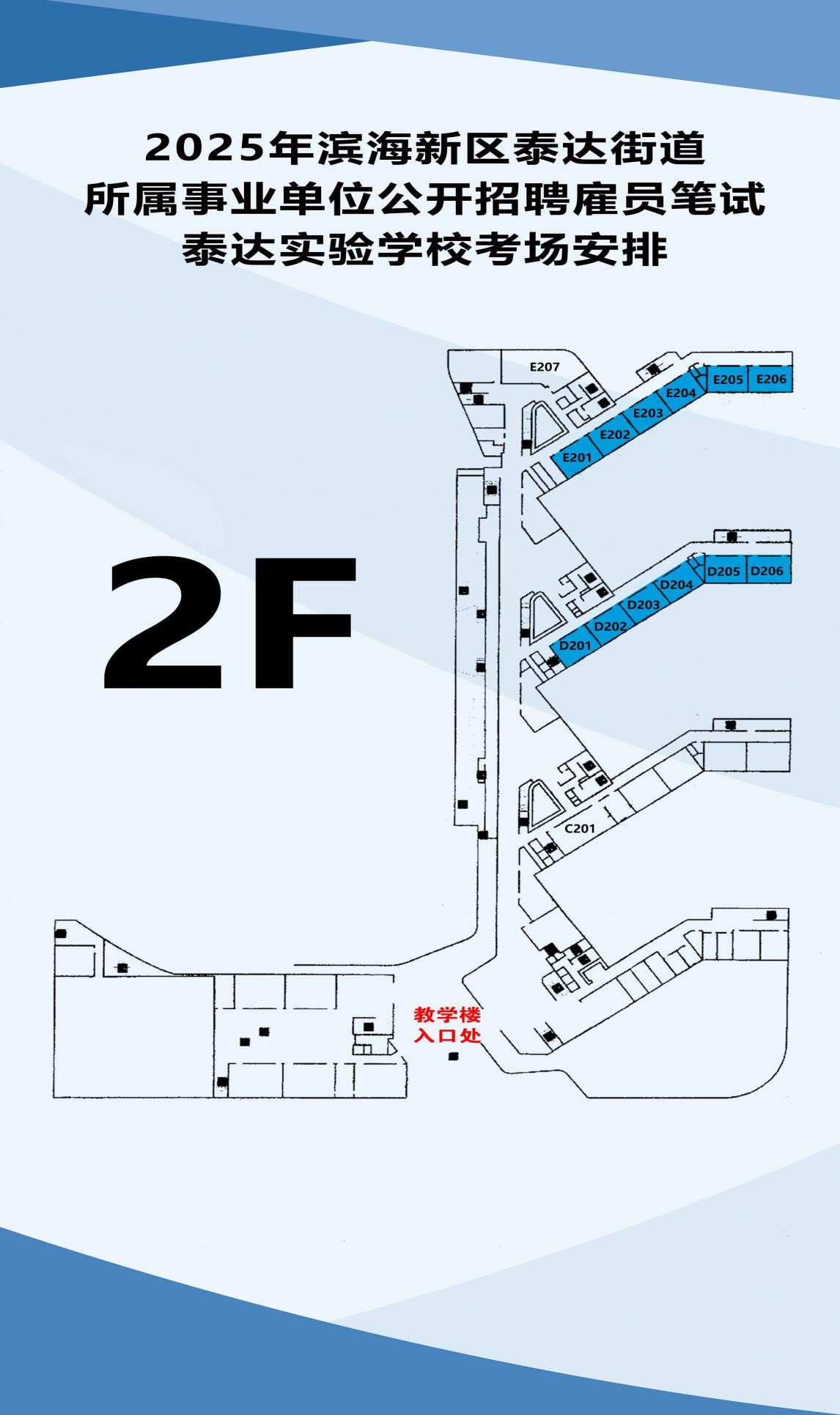 各位参加笔试考生: 以下为2025年滨海新区泰达街道所属事业单位公开招聘雇员笔试考场分布示意图,请各位考生根据自己的报考岗位和准考证号,按时准确到达指定考点参加笔试。 一、考点交通示意图 笔试地点:泰达实验学校西校区(开发区第三大街与太湖西路交口,从太湖西路东南门进入) ![]() 二、考场分布示意图 ![]() ![]() 三、考场安排示意图