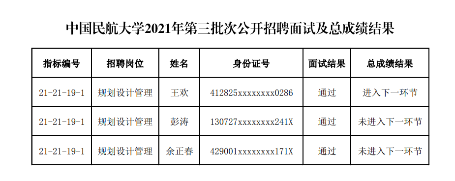 中国民航大学2021年第三批次公开招聘面试及总成绩结果