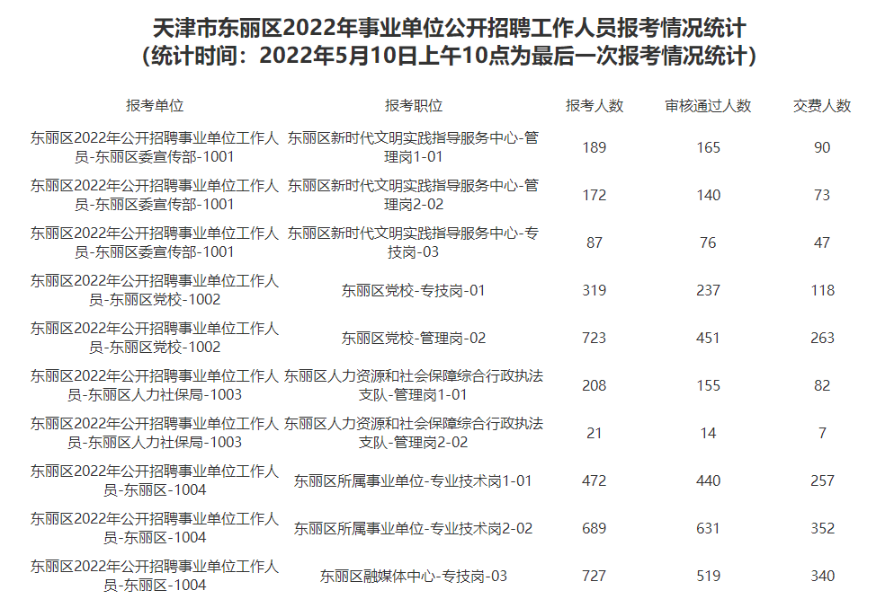 天津市东丽区2022年事业单位公开招聘工作人员报考情况统计(统计时间:2022年5月10日上午10点为最后一次报考情况统